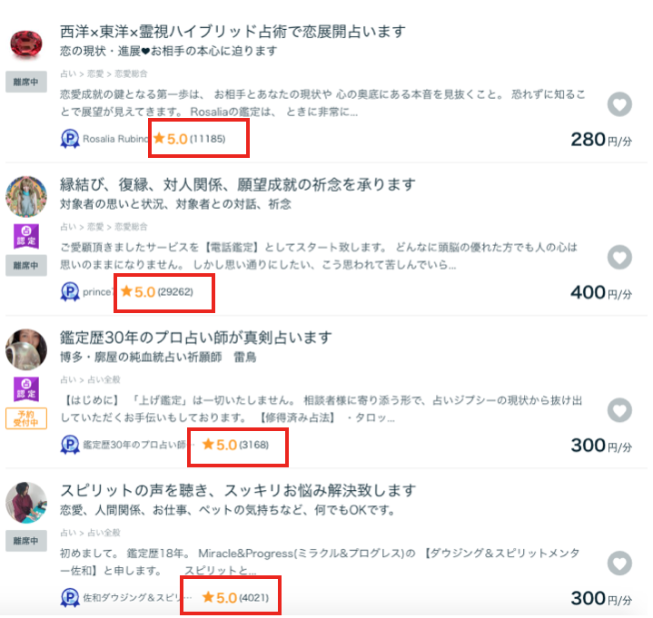 実際にココナラを見てみると、「占いをする」という商品が、1分300円程度で販売されていて、爆売れしています。